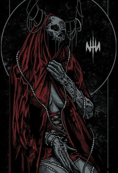 Este ser tiene una apariencia grotesca y aterradora, su figura es delgada y alargada, lo que le da un aire esquelético. Su piel parece ser de un tono grisáceo y pálido, similar a la carne en descomposición o a la tela envejecida, lo que refuerza su aspecto mórbido.La característica más distintiva de la criatura es la estructura que parece formar una especie de capucha o capa carnosa sobre su torso. Esta estructura se abre de manera antinatural para revelar un abismo oscuro y lleno de dientes afilados y carne desgarrada en su interior. Esta abertura parece ser una gran boca o garganta, dando la impresión de que podría devorar a sus presas enteras.Sus extremidades son largas y esqueléticas, con músculos apenas visibles que sugieren fuerza oculta. Las manos terminan en dedos alargados y garras afiladas, perfectas para desgarrar carne o trepar por superficies irregulares. Las piernas, aunque delgadas, parecen suficientemente fuertes como para permitirle movimientos rápidos y ágiles.No se observa un rostro tradicional en la criatura, lo que la hace aún más perturbadora. La falta de rasgos faciales claramente definidos, como ojos o nariz, le da una sensación de ser una aberración antinatural, un depredador de pesadillas.